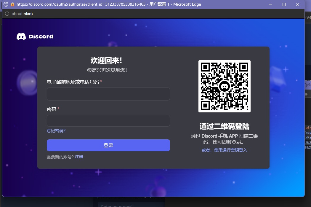 接着,我点击了验证按钮,弹出了一个Discord登录界面。我输入了准备好的账号和密码,完成了登录。